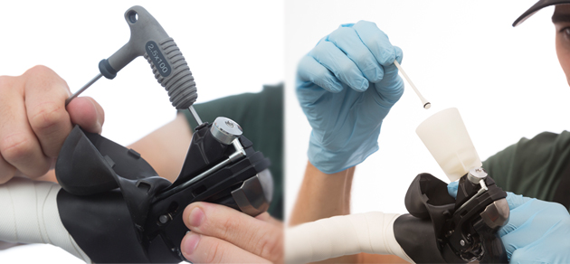 2- Atornilla el pasador que sujeta las pastillas a la pinza. Presta atención a no dañar la cabeza de los tornillos.