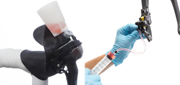 3- Llena la jeringa con aceite mineral Shimano. Asegúrate de que sacas todas las burbujas, tanto de la jeringa como del tubo.